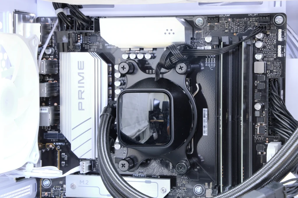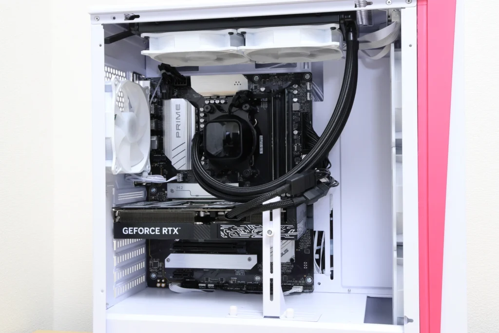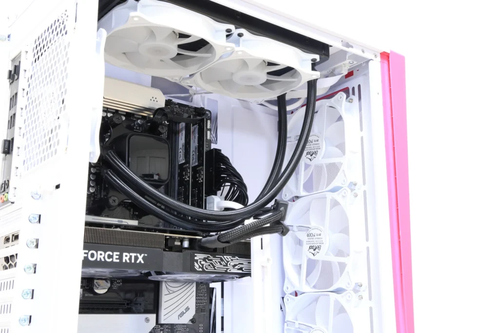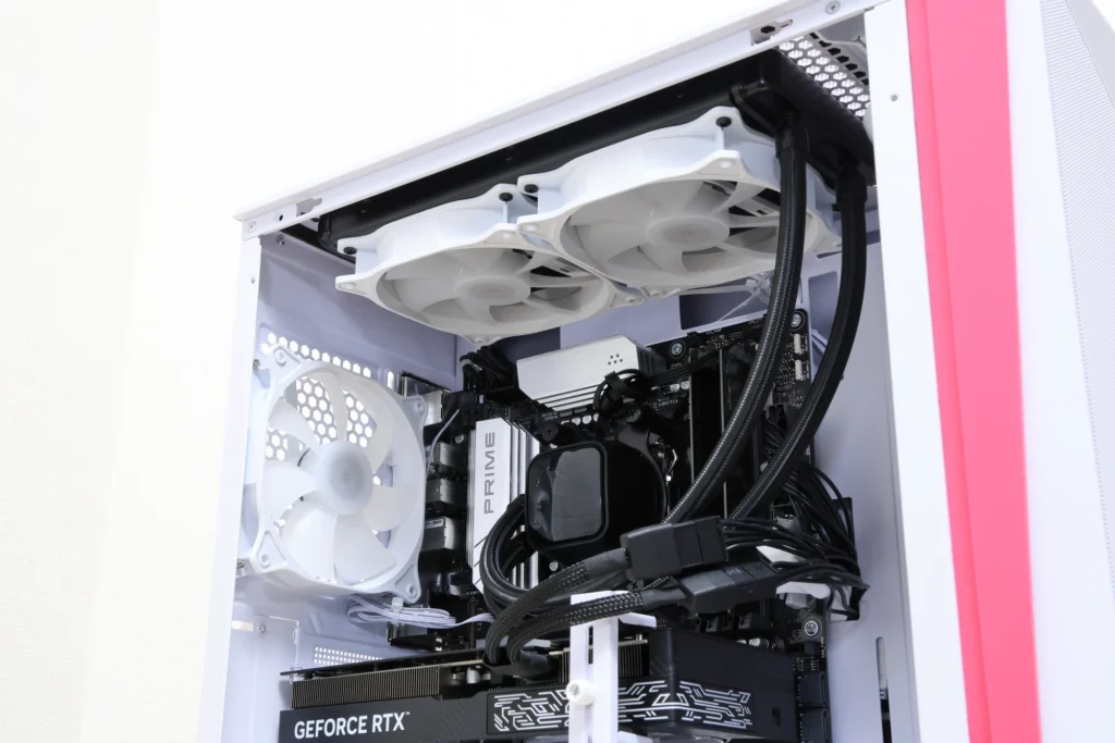 そして、CPUのクーラーは冷却性能と静音性が高い水冷式。240mmの大型ラジエーターを搭載しており、熱を吸った冷却液を効率よく冷やすことができます。