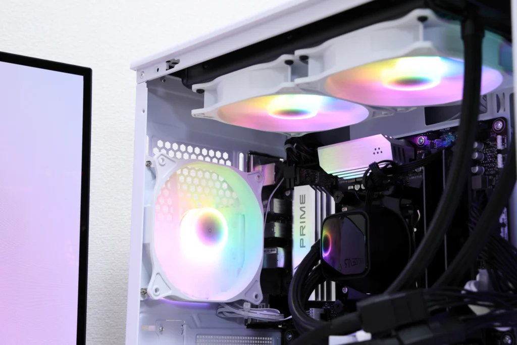 フロントには3連のRGBケースファンが搭載されているのも、空気をより取り込みやすくなるので、魅力的です。視覚的に楽しいだけでなく、冷却性能の高さにも一役買っています。