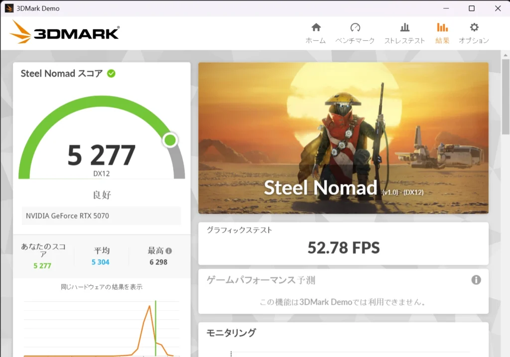 今回のスコアは 5277、平均フレームレートは 52.78 FPS でした。
