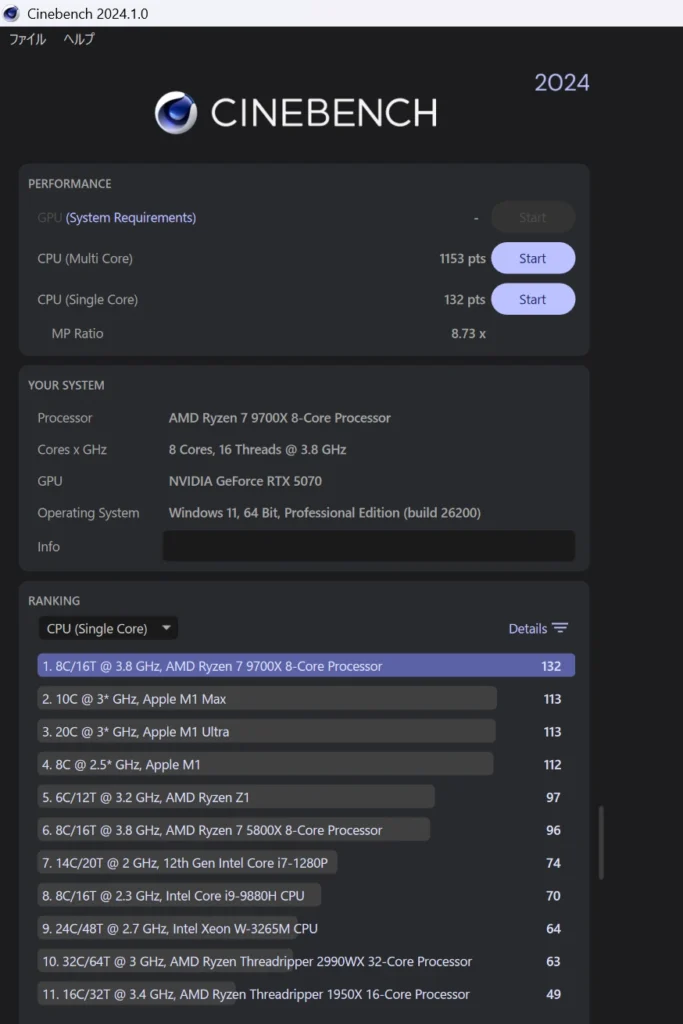 今回のテストでは、マルチコアが 1153 pts、シングルコアが 132 pts という結果になりました。