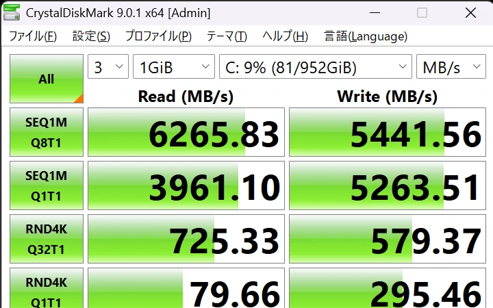 CrystalDiskMarkでストレージの速度を計測しました。 結果は、読み込み 6265.83MB/s、書き込み 5441.56MB/s。