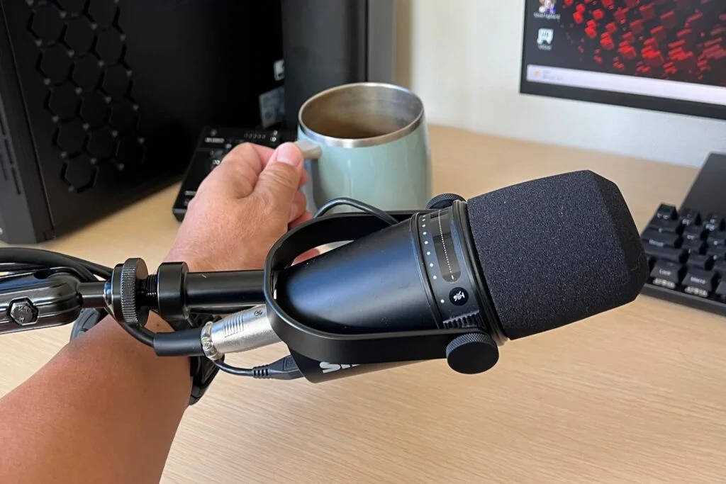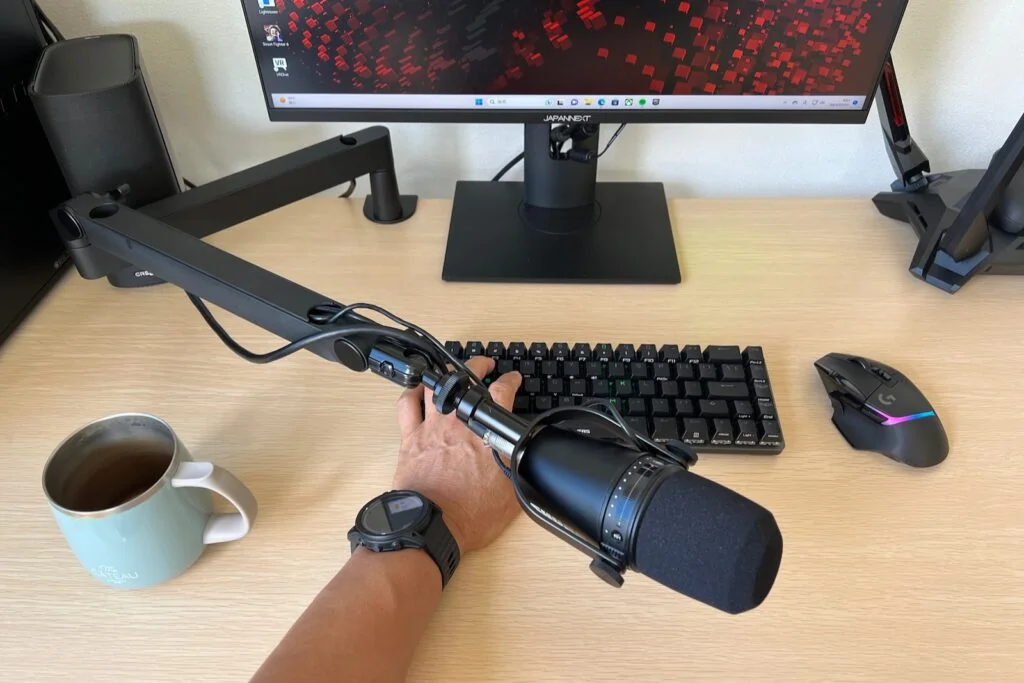 たとえば右利きの人の場合、右側にマウスを置きます。左側にドリンクを置くという人も多いですよね。マイクアームも聞き手とは反対方向に伸ばす人が多いですが、そうするとドリンクと干渉してしまいます。