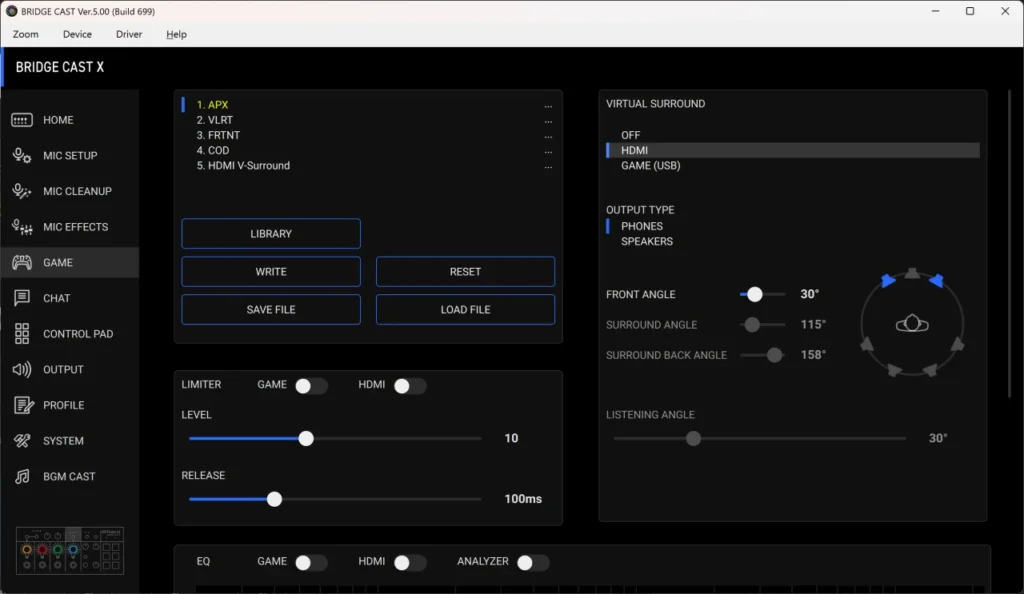 Game EQは10バンドで調整可能で、5スロットにカスタム設定を保存できます。 プロファイルを登録しておけばゲームタイトルの切り替え時にボタンひとつで呼び出せるので、複数のゲームを遊ぶ方にも便利です。
