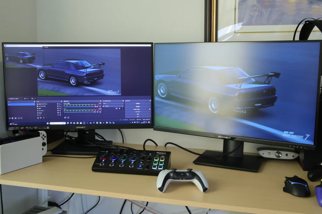 HDMIパススルー端子が搭載されているのも見逃せないポイント。 外部モニターに遅延なく映像を出力できるため、OBSでキャプチャーしながらラグのない状態でゲームプレイが可能です。 FPSのように一瞬の判断が求められるゲームでも、遅延を気にせず配信に集中できます。 PS5だけでなくSwitch 2にもHDMI接続で対応しているので、複数のゲーム機を使い分ける方にも便利です。