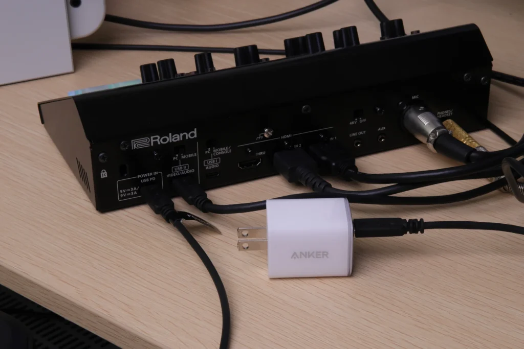 PCのUSBポートから十分な電力が供給できない場合は、USB POWER IN端子にUSB PD対応ACアダプターを接続する形です。 出力5V/3Aまたは9V/3Aに対応したものが必要になります。 Anker 521 Charger(Nano Pro)は5V/3A・9V/3Aいずれにも対応しており、問題なく使用できました。