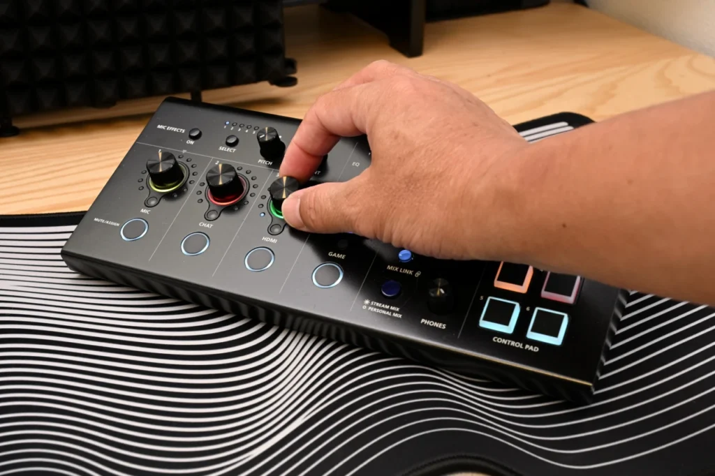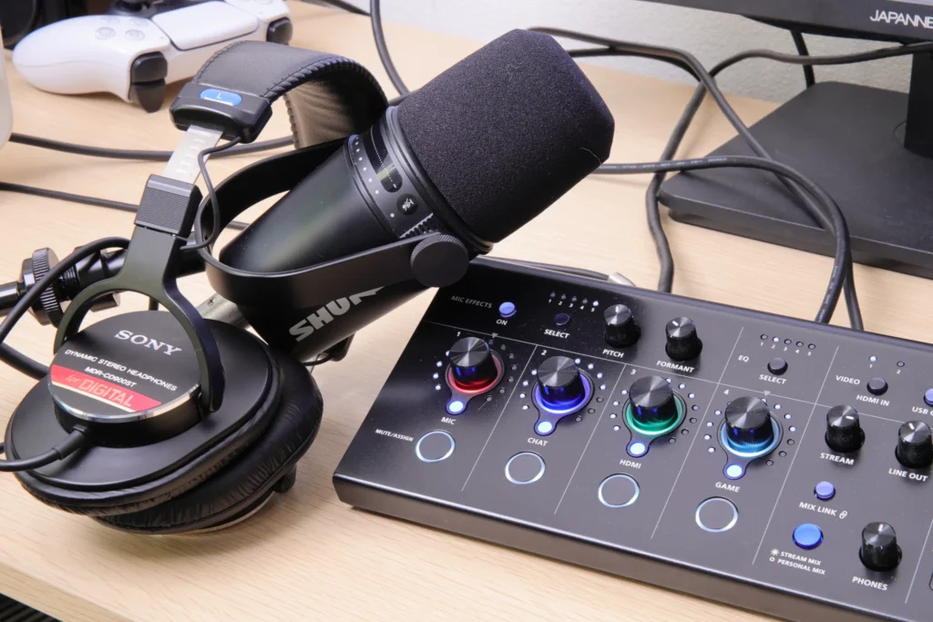 操作面は、MIC・CHAT・HDMI・GAMEと印字されたノブがわかりやすく並んでいます。 どこを回せば何が調整されるか、直感的に把握できるレイアウト。 ボタン数自体もそれほど多くないので、初心者でも慣れやすいです。