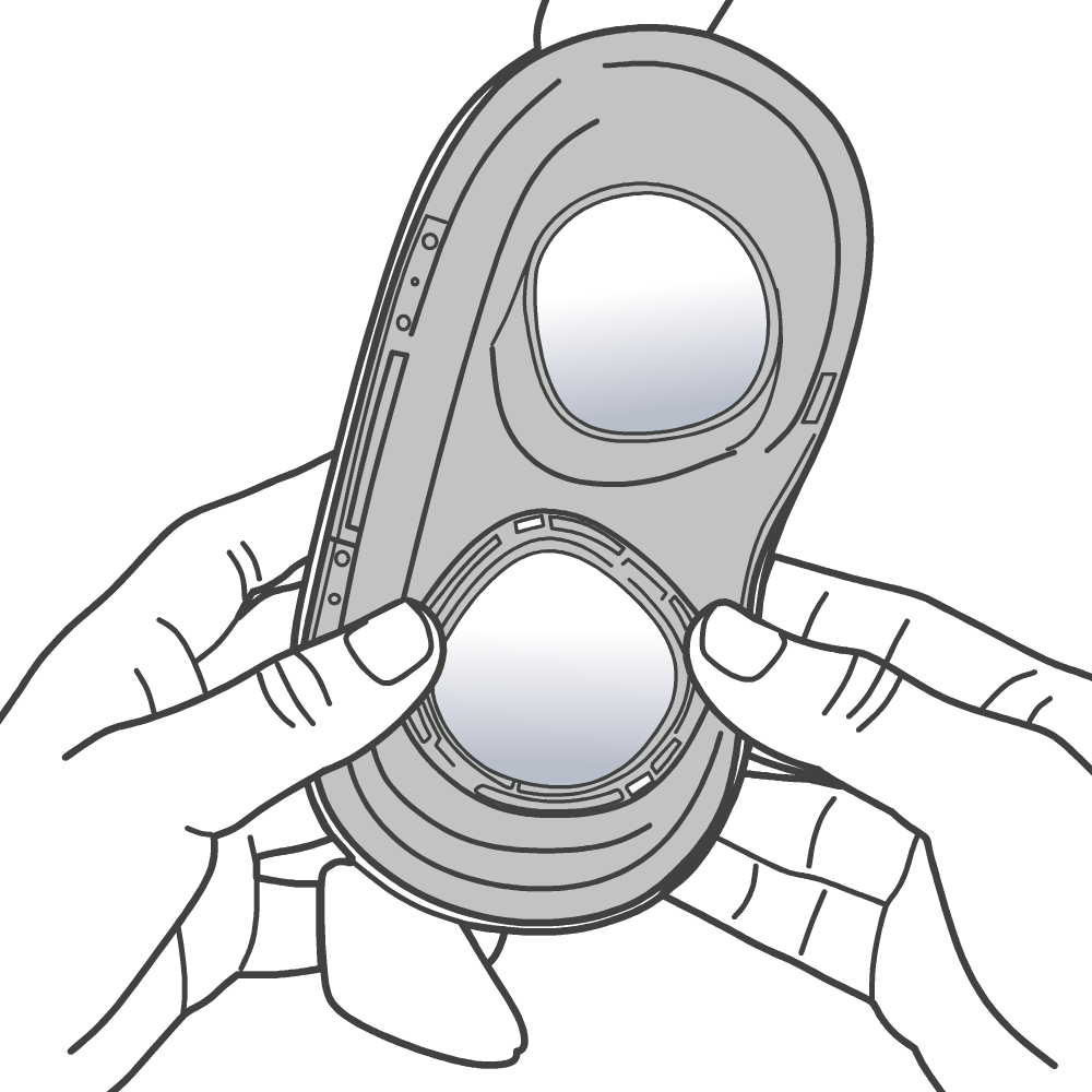 Quest2のレンズの下に小さな凹みが見えますね。この凹みが3か所あり、この凹みにメガネスペーサーのツメをはめ込んでいくところからスタートします。